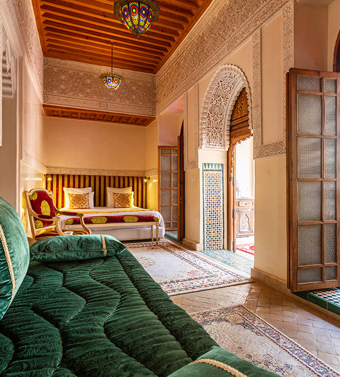 Malgré la proximité avec les lieux les plus animés de Marrakech, le Riad Sidi Benslimane reste un espace calme et reposant, parfaitement isolé du bruit extérieur.